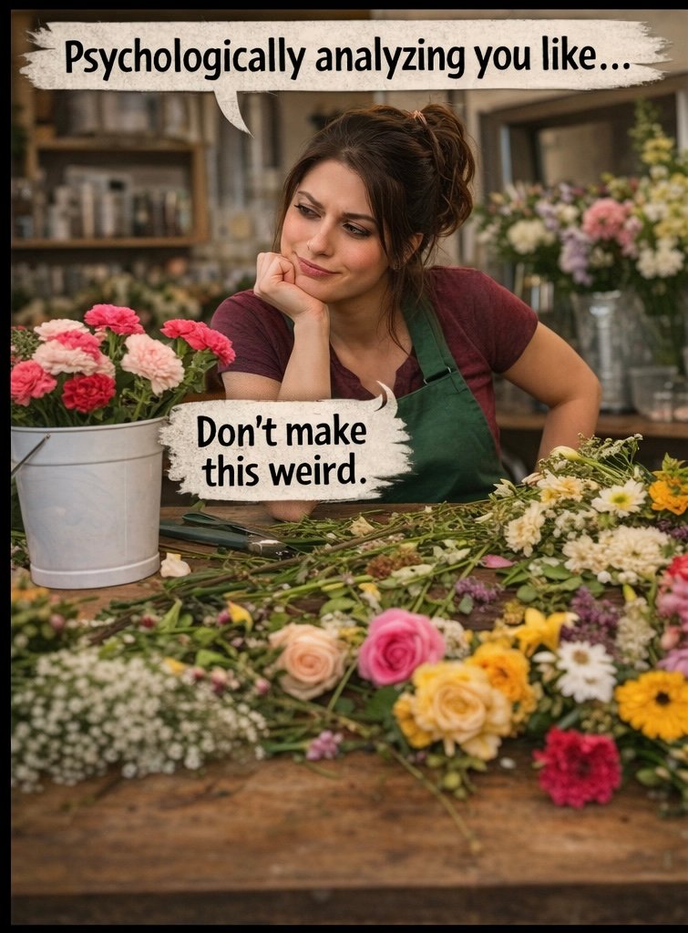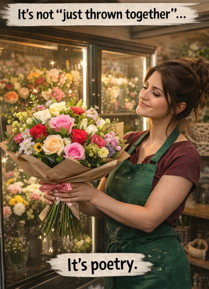 So now I’m standing in my shop, surrounded by hundreds of flowers, silently negotiating with roses, arguing with lilies, and side-eyeing the carnations like, “Don’t make this weird.” Meanwhile, you’re browsing greeting cards, completely unaware that I’m assembling what might become the emotional ambassador of your relationship.
